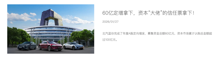 1月27日,北汽新能源控股股东北汽蓝谷发布公告,称完成60亿元A股定向增发。